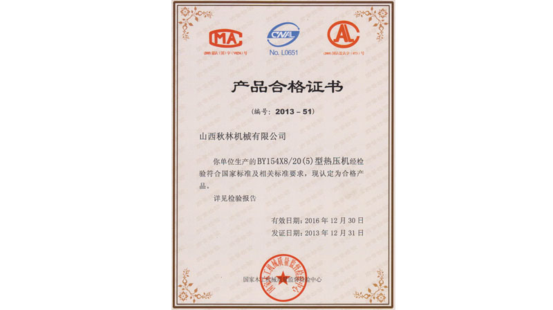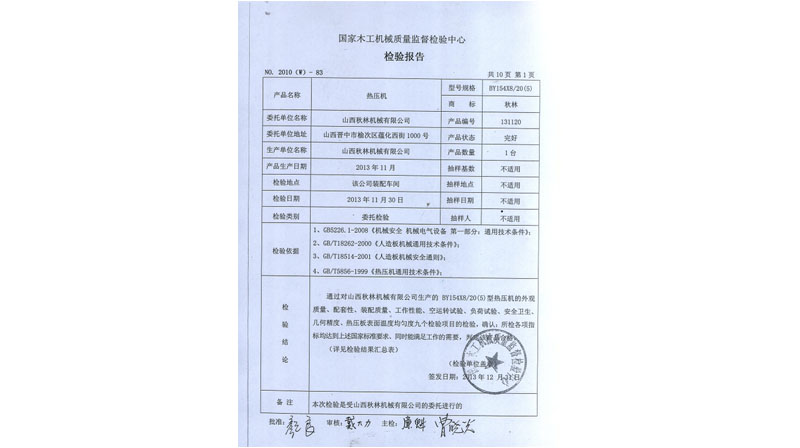 BY21型熱壓機(jī)、BY624×8/16、BY154×8/20(5)通過(guò)國(guó)家木工機(jī)械質(zhì)量監(jiān)督檢驗(yàn)中心檢驗(yàn)