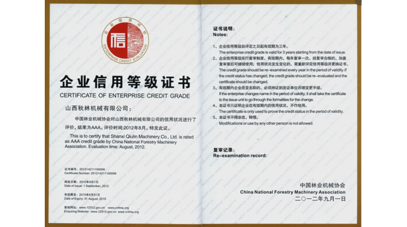 獲中國(guó)林業(yè)機(jī)械協(xié)會(huì)頒發(fā)的AAA級(jí)企業(yè)信用等級(jí)證書(shū)